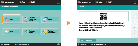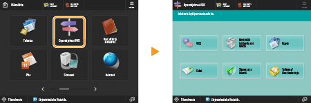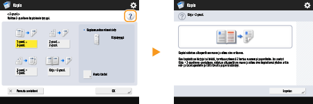 Näytä toiminto-opas ja UKK-sivu<Opasohjelma/UKK> avaa näytön, jossa esitellään laitteen toimintoja sekä kerrotaan vinkkejä kopiointiin, skannauksen yms. Avaa tämä näyttö, kun haluat saada lisätietoja toimintojen käytettävyydestä ja niiden käyttämisestä. UKK-sivulle pääsee myös mobiililaitteesta. ![]() Esimerkki 1: Kopiotoimintojen opas Kun valitset luettelosta nimikkeen, opasikkuna avautuu. ![]() Esimerkki 2: Näytä UKK-sivu Kun <UKK> valitaan, näkyviin tulee QR-koodi. Voit sitten näyttää laitteen UKK-sivun skannaamalla tämän QR-koodin mobiililaitteella, kuten matkapuhelimella tai tabletilla. ![]() Käytä Ohje-toimintoaNäytössä olevasta toiminnosta riippuen ylhäälle oikealle tulee joskus esiin kohta . Paina kohtaa tarkistaaksesi toiminnon kuvauksen ja toimintamenetelmän.![]() Palaa edelliseen näyttöön valitsemalla <Lopetus>. Toimi samalla tavalla kuin älypuhelimella (pyyhkäise / laajenna tai supista / vedä ja pudota)Joissakin näytöissä voit vaihtaa sivua tai selata pyyhkäisemällä sormellasi ylös/alas tai vasemmalle/oikealle, kuten älypuhelimella. ![]() Voit myös zoomata lähemmäksi ja kauemmaksi näytössä käyttämällä kahta sormea laajentamalla ja supistamalla. Voit vetää suurennettua ikkunaa sormellasi. Näytön ulkoasun ja toiminnallisten ehtojen mukauttaminen ![]() Jos <Ota käyttöön näytön suurennus> -asetuksena on <Kyllä>, koko näyttöä lähennetään/loitonnetaan, kun käytetään laajentamista tai supistamista esikatseluikkunassa. Jos <Ota käyttöön näytön suurennus> -asetuksena on <Ei>, vain esikatseluikkunaa lähennetään/loitonnetaan.