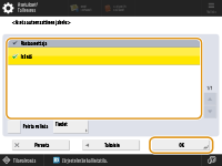 Laitetietojen jakelu ja päivitysLaitetietoja ei voi jakaa tai päivittää kun asiakaslaite käsittelee muuta dataa. Jos asiakaslaite ei pysty vastaanottamaan automaattisesti jaettua laitetietoa määrättynä aikana, jakelua ei suoriteta uudelleen ennen kuin seuraavana määritettynä aikana. Laitetietojen vastaanottaminen muista Canon-monitoimitulostinmalleistaJos laitetta käytetään asiakaslaitteena, se pystyy vastaanottamaan laitetietoa muista Canon-monitoimitulostinmalleista, kun <Vast.ottavan laitteen tietojen raj.> -asetukseksi valitaan <Vastaanoton asetukset> -kohdassa <Ei>. Huomaa kuitenkin, että joitakin tietoja ei ehkä jaeta oikein. Toimintojen valitseminen laitetietojen vastaanottoa vartenJos laitetta käytetään asiakaslaitteena, voit rajoittaa tietojen vastaanottamista, kun <Vast.oton rajoitus kaikissa toiminn.> -asetukseksi valitaan <Vastaanoton asetukset> -kohdassa <Ei>. Aikaisempien laitetietojen palauttaminenVoit suorittaa asiakaslaitteessa toimenpiteitä palauttaaksesi laitetiedot jotka olivat käytössä ennen kuin päivitys suoritettiin. Voit kuitenkin palauttaa vain tiedot jotka olivat käytössä viimeksi ennen päivitystä. Sitä vanhempaa tietoa ei voi palauttaa. Huomaa myös, että <URL-läh. asetukset> -asetus kohdassa <Aseta/Tallenna salaiset faksilokerot> (<Aseta/Tallenna salaiset faksilokerot>) voidaan poistaa, jos <Aset./Tall. arvo>- ja <Osoitekirja>-tietoja ei palauteta samanaikaisesti. <Laitetietojen jakeluasetukset> |