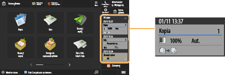 Aby uzyskać więcej informacji na temat ikon i pozycji wyświetlanych na osi czasu, patrz Pozycje wyświetlane na osi czasu Oś czasu może być wyświetlana niezależnie dla każdego logującego się użytkownika. Wspólna oś czasu może być wyświetlana dla niezalogowanych użytkowników, którzy nie używają uwierzytelniania, takich jak użytkownicy nielogujący się i użytkownicy-goście. Zmiana ustawień dla <Zezwól nie uwierzytelnio. użytkow. na użycie osi czasu> i <Zez. każdemu zalogo. użyt. na użycie osi czasu> według potrzeb. Dostosowanie ekranu <Strona główna> Oś czasu dla użytkowników nielogujących się, takich jak użytkownicy nieuwierzytelnieni i użytkownicy-goście, jest zachowywana, gdy dla opcji <Ust. Szybkiego Uruchom. dla Główn. zasilania> zostaje wybrane ustawienie <Włącz> i wykonane zostaje szybkie uruchomienie. Jeżeli zasilanie zostanie wyłączone, gdy dla opcji <Ust. Szybkiego Uruchom. dla Główn. zasilania> jest wybrane ustawienie <Wyłącz> albo szybkie uruchomienie nie może zostać przeprowadzone, oś czasu dla użytkowników nielogujących się, takich jak użytkownicy nieuwierzytelnieni i użytkownicy-goście, jest usuwana. Osi czasu nie można importować/eksportować. Importowanie/eksportowanie danych ustawień |
