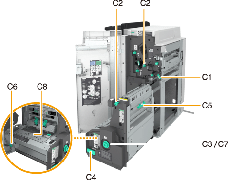 Lokalizacje zaciętego papieru są oznaczone numerami, takimi jak C1 lub C2, tak jak pokazano na rysunku poniżej.