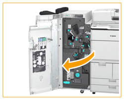 Empurre a unidade de finalização-agrafamento de novo para dentro da máquina e feche a tampa da frente do finalizador.