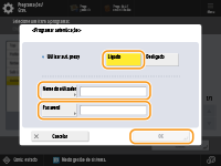 <Programar autenticação>Prima isto para especificar a informação de autenticação quando utilizar a função de autenticação do servidor proxy. Prima <Ligado> no ecrã visualizado, introduza o nome do utilizador e a palavra passe para autenticação proxy, e prima <OK>.