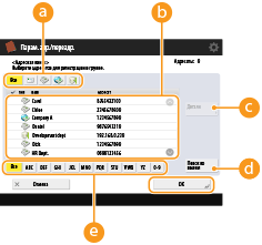 Выберите (электронная почта),  (факс), (И-факс) или  (файл), чтобы отфильтровать адресатов, которые отображаются в списке адресов (). Нажмите кнопку <Все>, чтобы отобразить всех зарегистрированных адресатов.