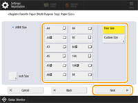 1 | Press <Custom Size>. ![]() You can specify the paper size as <Free Size>, which eliminates the need to enter the paper size setting. Specify <Free Size> when you load paper of unknown size to use for copying or when the paper size is already registered in the printer driver. |