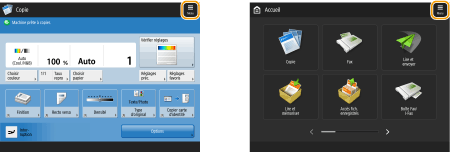 . L'écran <Accueil> affiche une liste des touches de fonction et sert d'accès à diverses fonctions. Éléments affichés dans l'écran <Accueil>![]() | ![]() | |