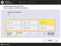 Si <Toujours spécifier> sous<Régl. par défaut plateau multifonctions> est réglé sur <Papier favori>, un écran s'affiche pour vous permettre de sélectionner votre « Papier favori » lorsque vous chargez le papier dans le plateau multifonctions. <Régl. par défaut plateau multifonctions> |
