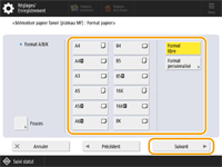 1 | Appuyez sur <Format personnalisé>. ![]() Vous pouvez spécifier la taille de papier <Format libre>, vous n'aurez alors pas besoin d'indiquer le réglage de la taille de papier. Spécifiez <Format libre> lorsque vous chargez du papier de taille inconnue pour faire des photocopies ou lorsque la taille de papier est déjà enregistrée dans le pilote de l'imprimante. |