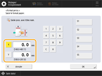 Appuyez sur <X> ou <Y> pour saisir la longueur de chaque côté avec le clavier numérique. ![]() Si vous enregistrez les formats de papier que vous utilisez fréquemment avec les boutons <S1> à <S5>, vous pouvez les appeler en appuyant sur une seule touche. Enregistrement de papier de format libre (papier de format personnalisé) | |