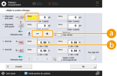 1 | Réglez le taux d'agrandissement/réduction (%) pour <Zoom (a)> et <Zoom (b)> sur l'écran <Régler la position d'image>  , puis appuyez sur <OK>. <Zoom (a)>Agrandit ou réduit l'image dans le sens qui est parallèle à la direction de chargement conformément au taux saisi. <Zoom (b)>Agrandit ou réduit l'image dans le sens qui est perpendiculaire à la direction de chargement conformément au taux saisi. Le cas échéant, essayez d'imprimer à nouveau le papier de la page de test et vérifiez ensuite la correction. |