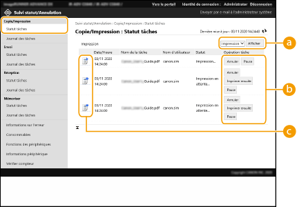 Vous pouvez vérifier les statuts des fax et des e-mails qui sont en attente pour être envoyés, des fax qui ont été reçus et des fax en attente de transmission. Vous pouvez aussi annuler le processus d'envoi et de réception des documents.