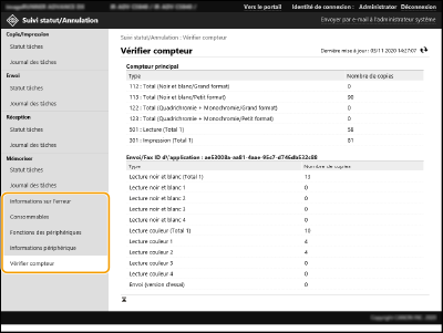 Vous pouvez vérifier diverses informations sur la machine, comme des informations d'erreur, la quantité restante de papier et d'encre, des informations sur l'équipement optionnel relié et le nombre total de pages qui ont été imprimées jusqu'à maintenant.