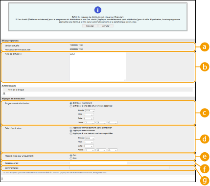 Pour télécharger le microprogramme immédiatement, sélectionnez [Distribuer maintenant]. Pour télécharger automatiquement le microprogramme à une date et une heure prédéfinies, sélectionnez [Diffuser à une date et une heure prédéfinies], puis définissez la date et l'heure dans [Année]/[Mois]/[Date]/[Heure]. Vous pouvez fixer une date et une heure situées dans la semaine à venir.