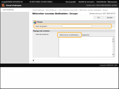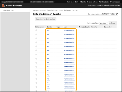 [Liste d'adresses pour administrateurs] n'est disponible que pour les administrateurs qui se connectent avec les privilèges Administrateur ou DeviceAdmin.
