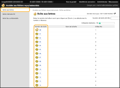 ![]() | Vous pouvez utiliser l'interface utilisateur distante pour imprimer, envoyer ou supprimer des fichiers qui sont stockés dans la boîte courrier ou des fax et I-faxes qui sont temporairement stockés dans la boîte courrier Fax/I-Fax. |