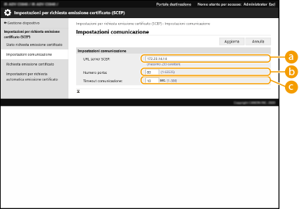 È possibile specificare le impostazioni di comunicazione con il server SCEP.
