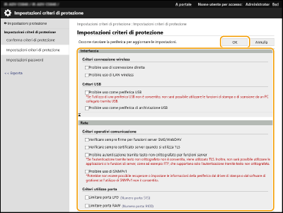 Le impostazioni della macchina relative alla sicurezza delle informazioni possono essere applicate e gestite in batch. Si consiglia all'amministratore della sicurezza delle informazioni incaricato della gestione del criterio di sicurezza di applicare il criterio di sicurezza alla macchina conformemente al criterio della propria organizzazione. Per configurare il criterio di sicurezza, accedere alla IU remota con i privilegi di Amministratore.