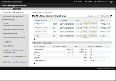 Wenn Sie auf die Schaltfläche [Start] / [Stopp] klicken, die sich rechts neben dem Betriebsstatus befindet, können Sie die MEAP-Anwendung starten oder stoppen.