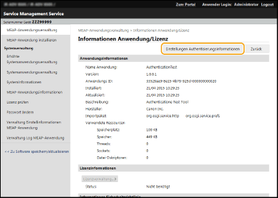 Wenn Sie auf den Namen einer MEAP-Anwendung klicken, werden detaillierte Informationen wie Firmenname und Speicherbelegung für jede Anwendung angezeigt. Die Lizenzverwaltung wird von hier aus durchgeführt. Verwalten der MEAP-Anwendungslizenzen