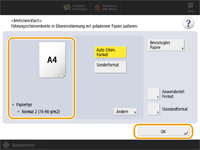 Wenn Papierformat und Papiertyp gewechselt werdenWenn Sie Papier eines anderen Typs in das Gerät einlegen, müssen Sie die Einstellungen ändern. Andernfalls kann das Gerät nicht richtig drucken. Angeben von Format und Typ des Papiers im Papiermagazin/ in der Papierkassette Wenn Sie das Papierformat wechseln, ersetzen Sie auch das Papierformatetikett entsprechend. (Anbringen des entsprechenden Papierformatetiketts) Beachten Sie, dass das Papierformatetikett Papierformate enthalten kann, die auf dem Gerät nicht verfügbar sind. |