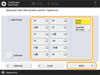 1 | Drücken Sie <Anwenderdef.Format>. ![]() Sie können das Papierformat als <Sonderformat> angeben, sodass Sie die Einstellung für das Papierformat nicht eingeben müssen. Legen Sie <Sonderformat> fest, wenn Sie Papier eines unbekannten Formats zum Kopieren einlegen oder wenn das Papierformat bereits im Druckertreiber gespeichert ist. |