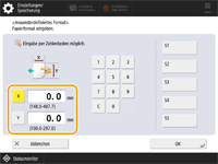 Drücken Sie <X> oder <Y>, um die Länge der einzelnen Seiten mit den Zahlentasten einzugeben. ![]() Wenn Sie das häufig verwendete Papierformat auf Tasten <S1> bis <S5> registrieren, können Sie diese dann per Tastendruck aufrufen. Registrieren von Papier in Sonderformat (Anwenderdefiniertes Papierformat) | |