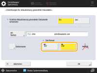 Sie können eine Kopie eines versendeten Dokuments speichern, indem Sie an mehrere Empfänger versenden, welche ein Faxziel auf dem Bildschirm "Grundeigenschaften des Scannens" enthalten. Um Faxziele auf dem Bildschirm "Grundeigenschaften des Scannens" anzuzeigen, muss <Fax in der Funktion Scannen und Senden aktivieren> auf <Ein> eingestellt sein. <Faxfunktion anzeigen>