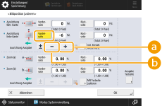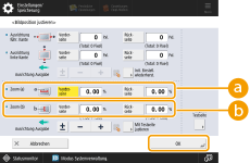 1 | Legen Sie das Vergrößerungs-/Verkleinerungsverhältnis (in %) für <Zoom (a)> und <Zoom (b)> auf dem Bildschirm <Bildposition justieren> fest  drücken Sie <OK>. <Zoom (a)>Vergrößert oder verkleinert das Bild entsprechend dem eingegebenen Verhältnis parallel zur Zuführungsrichtung. <Zoom (b)>Vergrößert oder verkleinert das Bild entsprechend dem eingegebenen Verhältnis lotrecht zur Zuführungsrichtung. Falls erforderlich, drucken Sie die Testseite erneut aus, um das Ausmaß der Korrektur zu überprüfen. |