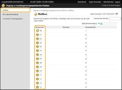 ![]() | Sie können Remote UI verwenden, um in der Mailbox gespeicherte Dateien bzw. vorübergehend in der Fax/I-Fax Eingangsbox gespeicherte Faxe und I-Faxe zu drucken, zu senden oder zu löschen. |