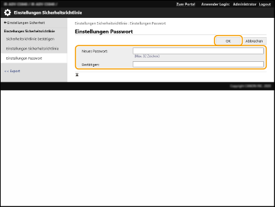Geben Sie das aktuelle Passwort unter [Altes Passwort:] ein, und klicken Sie auf [OK] ohne einen Wert für [Neues Passwort:] oder [Bestätigen:] einzugeben (lassen Sie sie leer). Wenn ein Zeicheneingabegrenzwert unter [Einstellungen Passwort-Richtlinie] konfiguriert wurde, dann müssen Sie einen Wert bei dieser Einstellung eingeben. Löschen Sie den Grenzwert, bevor Sie das Passwort entfernen. Einstellungsoptionen der Sicherheitsrichtlinien