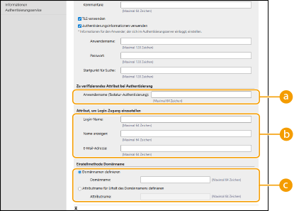 4 | Geben Sie an, wie Attributnamen und Domainname festzulegen sind. ![]() [Anwendername (Tastatur-Authentisierung):]Legen Sie das LDAP-Datenfeld (Attributname) für den Benutzernamen auf dem LDAP-Server fest (Beispiel: uid). [Login-Name:] / [Name anzeigen] / [E-Mail-Adresse]Legen Sie die LDAP-Datenfelder (Attributnamen) für den Anmeldenamen, Anzeigenamen und die E-Mail-Adresse des jeweiligen Benutzerkontos auf dem LDAP-Server fest (Beispiel: uid, cn, mail). [Domännamen definieren] / [Attributname für Erhalt des Domännamens definieren]Wählen Sie, wie der Domänenname des Anmeldeziels festgelegt werden soll. Um den Domänennamen direkt festzulegen, wählen Sie [Domännamen definieren], und geben Sie den Domänennamen* ein. Um ein LDAP-Datenfeld (Attributname) festzulegen, aus dem der Domänenname auf dem LDAP-Server bezogen wird, wählen Sie [Attributname für Erhalt des Domännamens definieren], und geben Sie dann den Attributnamen ein (Beispiel: dc). |