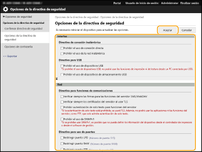 Las opciones del equipo relativas a la seguridad de la información se pueden aplicar y gestionar en lote. Es recomendable que el administrador de la seguridad de la información encargado de gestionar la política de seguridad la aplique al equipo siguiendo la política de su organización. Para configurar la política de seguridad, inicie una sesión en la IU remota con privilegios de administrador.