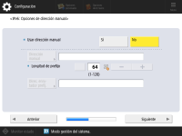 Especifique las opciones de la conexión de red. ![]() ![]() Pulse <Sí> para <Usar IPv4> o <Usar IPv6>, y pulse <Siguiente>. También puede utilizar IPv4 e IPv6. Si pulsa <No> para <Usar IPv4> y <Usar IPv6>, y pulsa <Aceptar>, omita las opciones de red y continúe al paso 11. ![]() Si pulsa <Sí> para <Usar IPv4>, especifique las opciones siguientes. ![]() Para obtener la dirección IP automáticamente, pulse <DHCP> o <IP autom.>, y pulse <Siguiente> o <Aceptar>. Para configurar la dirección IP manualmente, quite la selección de <DHCP> o de <IP autom.>, pulse <Dirección IP>, <Máscara de subred> y <Dirección de puerta enlace> para introducir cada valor, y pulse <Siguiente> o <Aceptar>. Para obtener información sobre las opciones de la dirección IPV4, consulte Configurar una dirección IPv4. ![]() Si pulsa <Sí> para <Usar IPv6>, especifique las opciones siguientes. ![]() Pulse <Sí> para utilizar la dirección sin estado, o <No> para no utilizarla, y pulse <Siguiente>. Para obtener información sobre la dirección IPv6, consulte Configurar una dirección IPv6. ![]() Tras especificar la dirección sin estado, indique las opciones siguientes. ![]() Pulse <Sí> para utilizar la dirección manual, o <No> para no utilizarla, y pulse <Siguiente>. Para utilizar la dirección manual, pulse <Dirección manual>, <Longitud de prefijo>, y <Direc. enrutador prefij.> para introducir cada valor. ![]() Tras especificar la dirección manual, indique las opciones siguientes. ![]() Pulse <Sí> para utilizar DHCPv6 o <No> para no utilizar DHCPv6, y pulse <Aceptar>. | |