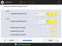 Especifique la dirección del servidor DNS, el nombre del host DNS y el nombre del dominio DNS. ![]() ![]() Pulse <Servidor DNS primario> y <Servidor DNS secundario>, introduzca la dirección IPV4/IPv6 para el servidor DNS y pulse <Siguiente>. Para obtener información sobre las opciones de la dirección del servidor DNS, consulte Configurar opciones de DNS. ![]() ![]() Pulse <Nombre de host> para introducir el nombre del equipo (nombre de host). Pulse <Nombre de dominio> para introducir el nombre de dominio al que pertenece el equipo, y pulse <Siguiente>. Si las opciones de IPv4 y IPv6 son iguales, pulse <Sí> para <Usar el mismo nombre de host/nombre de dominio que para IPv4>. ![]() ![]() Para actualizar automáticamente mediante las Opciones de actualización dinámica de DNS, pulse <Sí> para <Actualización dinámica de DNS>, y pulse <Aceptar>. Si configura <Actualización dinámica de DNS> para <IPv6> como <Sí>, seleccione <Sí> para registrar los elementos automáticamente. | |