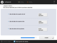 Puede imprimir la lista de usuarios de la red, la lista de datos de usuarios de fax y la lista de valores ajustados. ![]() ![]() Pulse <Iniciar impresión> para el informe que desee imprimir. Una vez finalizada la impresión, o si no desea imprimir una lista, pulse <Aceptar>. | |