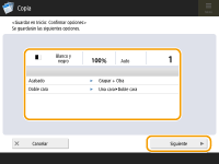 Para registrar un botón Personal, tiene que iniciar una sesión con la gestión de autenticación personal. Configurar las opciones de la administración de autenticación personal Si selecciona <Inf. autentic. inicio de sesión de dispositivo> para <Inf. usada para aut. TX/exploración de arch.>, no se almacenará una contraseña para un destino de archivo en un botón personal. <Inf. usada para aut. TX/exploración de arch.> Para obtener información acerca de la cantidad máxima de botones personales/compartidos que es posible registrar, consulte Funciones de gestión. Los botones personales pueden cambiarse a botones compartidos y viceversa. Para hacerlo, recupere las opciones y registre otro botón desde <Menú>. Mantenga pulsado un botón para cambiar su nombre/comentario o moverlo/eliminarlo. Pueden realizarse las mismas operaciones (cambiar el nombre/comentario de un botón o moverlo/eliminarlo) desde <Menú> en la pantalla <Inicio>. Personalización de la pantalla <Inicio> Los botones personales pueden compartirse entre varios dispositivos sincronizando los datos personalizados. Lista de elementos que se pueden personalizar Opciones que se pueden registrar en los botones personales/compartidosLas funciones y opciones que se pueden registrar en los botones personales/compartidos son las siguientes. Opciones que se pueden registrar en <Opciones favoritas> para la función <Copia> Reducir operaciones de copia <Fax> opciones de función del equipo Operaciones básicas para enviar faxes Opciones que se pueden registrar en <Opciones favoritas> para la función <Leer y enviar> Funciones de lectura útiles Opciones que se pueden registrar en <Opciones favoritas> para la función <Leer y guardar> Configurar la pantalla y las operaciones para escanear y luego guardar Guarde ubicaciones para las funciones <Leer y guardar> y <Archivos guardados> Usar el espacio de almacenamiento Accesos directos a la pantalla Funciones básicas para la función <Buzón de fax/I-fax> Se pueden registrar el acceso a un servidor y la contraseña de inicio de sesión en los botones personales/compartidos. Esto resulta cómodo para omitir la introducción de contraseña al recuperar el botón registrado. Si desea establecer la contraseña en la configuración almacenada del botón registrado, en vista de que importa con frecuencia ajustes en un botón personal o compartido a otro equipo y desea evitar que se finja ser otro usuario, excluya la contraseña al registrarse. Importar/exportar los botones registradosPuede importar y exportar los botones Personales/Compartidos registrados desde la IU remota. Importar/exportar todas las opciones En función del modelo del que se importen los botones, es posible que no pueda importar todas las opciones de los botones compartidos/personales. Para obtener más información, póngase en contacto con su distribuidor o representante del servicio técnico. |
