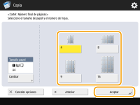 Especifique la escala de ampliación de la imagen para crear un póster. El tamaño de papel óptimo y el número de hojas se seleccionan automáticamente en función del tamaño del original y de la escala de copia.