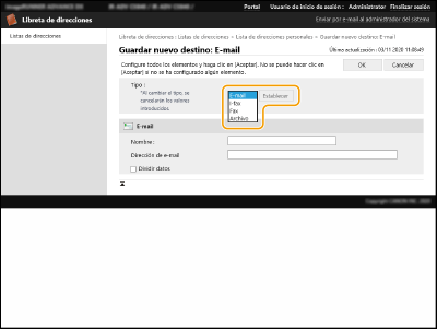 [Lista de direcciones para administradores] solo está disponible para los administradores que inicien sesión con privilegios de Administrador o DeviceAdmin (Administrador de dispositivo).