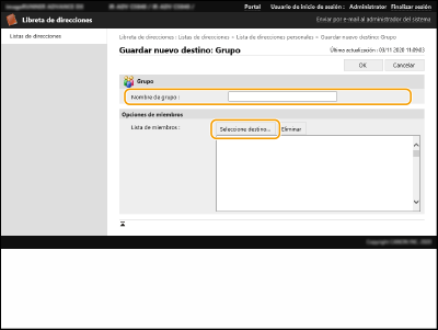 Para gestionar las Listas de direcciones de grupos de usuarios, también puede permitir únicamente a los usuarios con privilegios de Administrador registrar/editar los destinos desde la IU remota. <Usar lista de direcciones de grupos de usuarios>