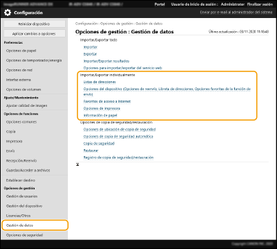 Puede seleccionar opciones concretas para importar o exportar, como listas de direcciones de la Libreta de direcciones u opciones de la impresora. Para realizar estas operaciones tiene que iniciar una sesión con privilegios de Administrador.