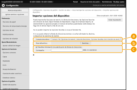 Al importar opciones de dispositivo (Opciones de reenvío, Libreta de direcciones, Opciones favoritas de la función enviar)