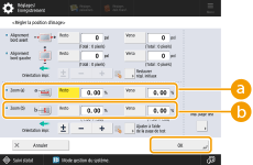 1 | Réglez le taux d'agrandissement/réduction (%) pour <Zoom (a)> et <Zoom (b)> sur l'écran <Régler la position d'image>  , puis appuyez sur <OK>. <Zoom (a)>Agrandit ou réduit l'image dans le sens qui est parallèle à la direction de chargement conformément au taux saisi. <Zoom (b)>Agrandit ou réduit l'image dans le sens qui est perpendiculaire à la direction de chargement conformément au taux saisi. Le cas échéant, essayez d'imprimer à nouveau le papier de la page de test et vérifiez ensuite la correction. |