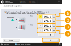 3 | Saisissez la longueur de la page de test sur les deux côtés avant et arrière  , puis appuyez sur <OK>. Par exemple, si la longueur mesurée de <a> est 360,4 mm, saisissez 360,4. La différence de longueur (0,4 mm dans ce cas), est automatiquement réduite de sorte que l'image est imprimée à la bonne taille. <a>Saisissez la longueur mesurée du repère <a> sur la page de test. <b>Saisissez la longueur mesurée du repère <b> sur la page de test. Le cas échéant, essayez d'imprimer à nouveau la page de test et vérifiez ensuite la correction. |