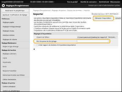 Dans [Mot de passe de décryptage], saisissez le même mot de passe que celui qui a été saisi quand les données de réglage ont été exportées.