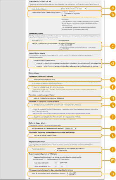 La méthode d'authentification sélectionnée pour [Méthode d'authentification du service Web :] est également utilisée pour l'authentification personnelle lors de la distribution des informations de l'appareil. Authentification utilisateur en cas de diffusion des informations de périphérique