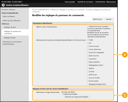 Si la case [Afficher l'écran de connexion lors de la sélection de fonctions nécessitant authentification] est cochée et la case [Fax] ou [Lire et envoyer] est cochée dans [Sélectionner les fonctions nécessitant authentification] :