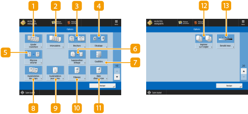 | <Echantillon impression> apparaît seulement si vous réglez des impressions multiples et l’un des réglages suivants en même temps. Notez que les fonctions disponibles peuvent varier en fonction de votre modèle et des options installées. <Tri séq. (Ordre pages)> <Décalage> <Rotation de 90 degrés> <Agrafage + Tri séquentiel> <Brochure> <Couverture de dessus> <Intercalaires> <Fusionner les fichiers et imprimer> lorsque plusieurs fichiers sont sélectionnés |