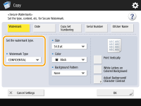 | | Ao copiar documentos que possuem informações confidenciais, você pode incorporar texto invisível, como "ULTRASECRETO" ou "CONFIDENCIAL" para avisar usuários não autorizados a não copiá-los. Quando você copiar um documento que já foi copiado, o texto incorporado aparecerá em toda a página, impedindo a cópia não autorizada dessas cópias. Opções do SistemaDependendo da máquina usada, essa função estará disponível como padrão. |