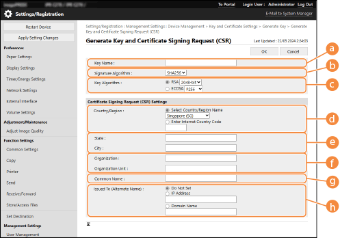 Você pode gerar uma chave e uma CSR na máquina. Você também pode exibir os dados de CSR na tela e exportá-los como um arquivo.