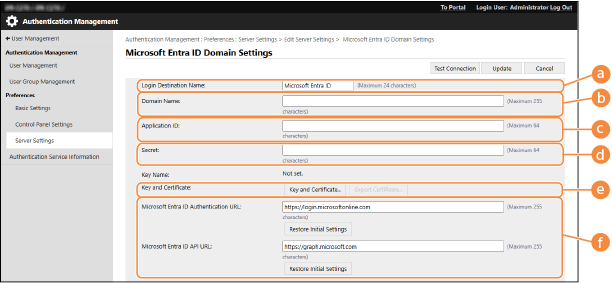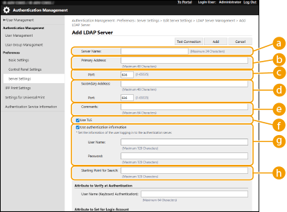 Para especificar um Active Directory/servidor LDAP/Microsoft Entra ID como dispositivo de autenticação adicional, você deverá registrar as informações do servidor usado para autenticação. Se necessário, faça um teste de conexão.