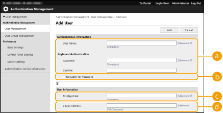 Marque a caixa de seleção para definir que a senha que o usuário registrar não tenha data de validade. Esta configuração pode ser especificada quando [Password Validity Period] está configurado como [Off] em [Password Settings Policy] em [Authentication] em [Security Policy Settings].